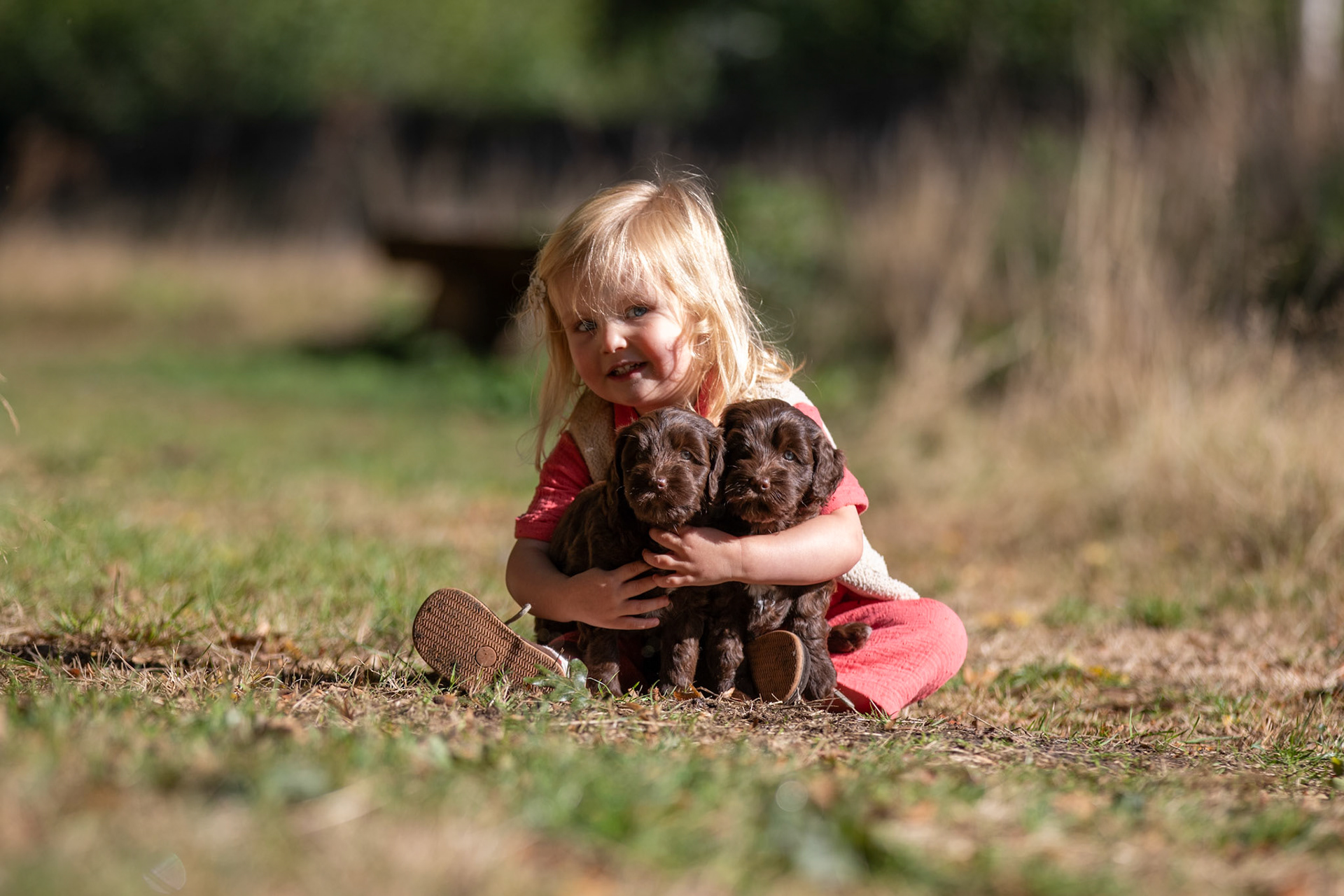 We zijn eventjes met de pups naar de groenstrook tegenover ons huis gegaan om foto's te maken. De eerste keer van huis weg, en ze waren best stoer de omgeving aan het ontdekken! En natuurlijk helpt Loïs goed mee om de pups in de gaten te houden, en wilde ze graag even op de foto met de twee bruine meisjes,