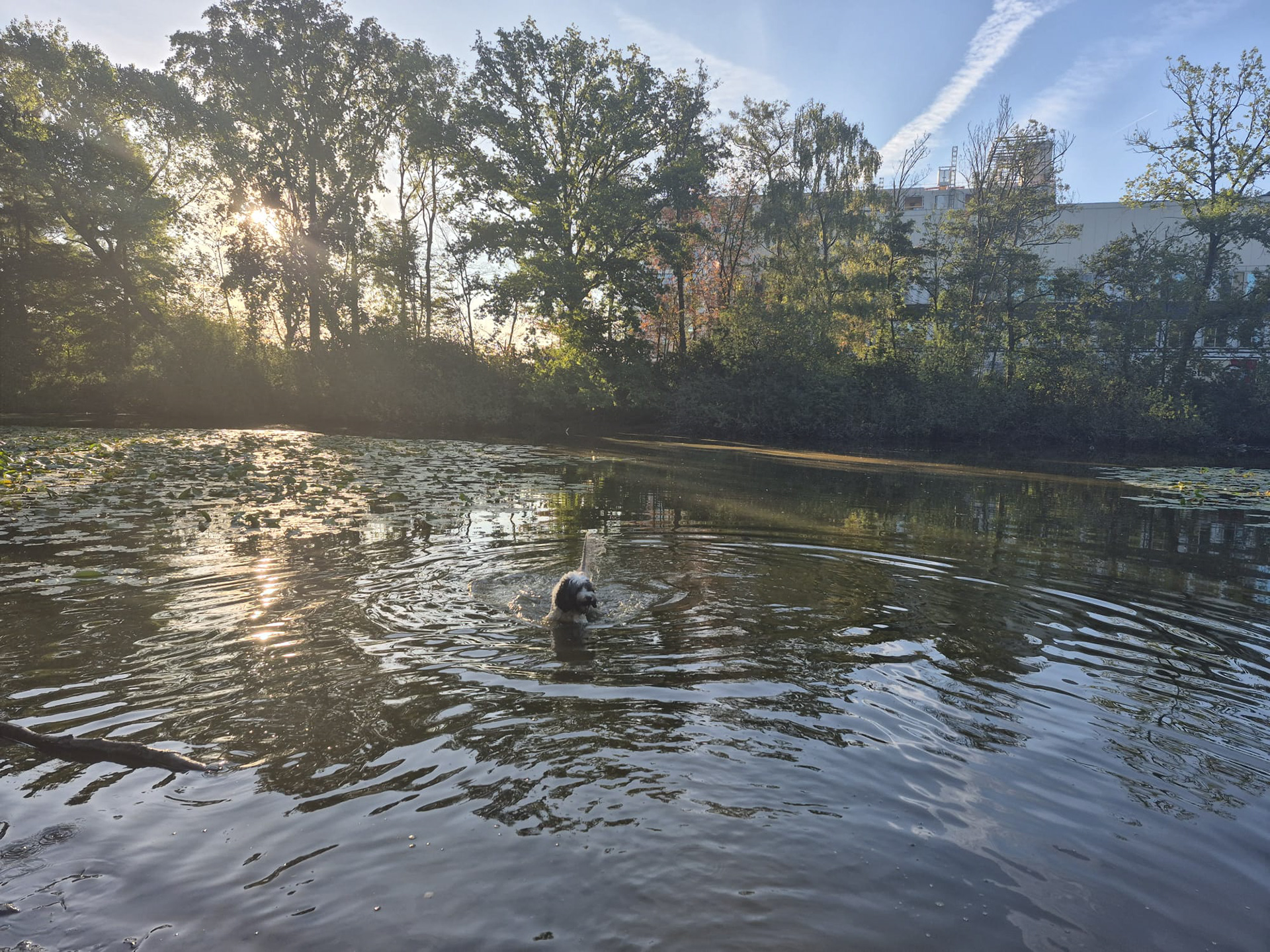 En Bella geniet van een welverdiende pauze en een heerlijke duik in het vennetje bij ons in het park :)