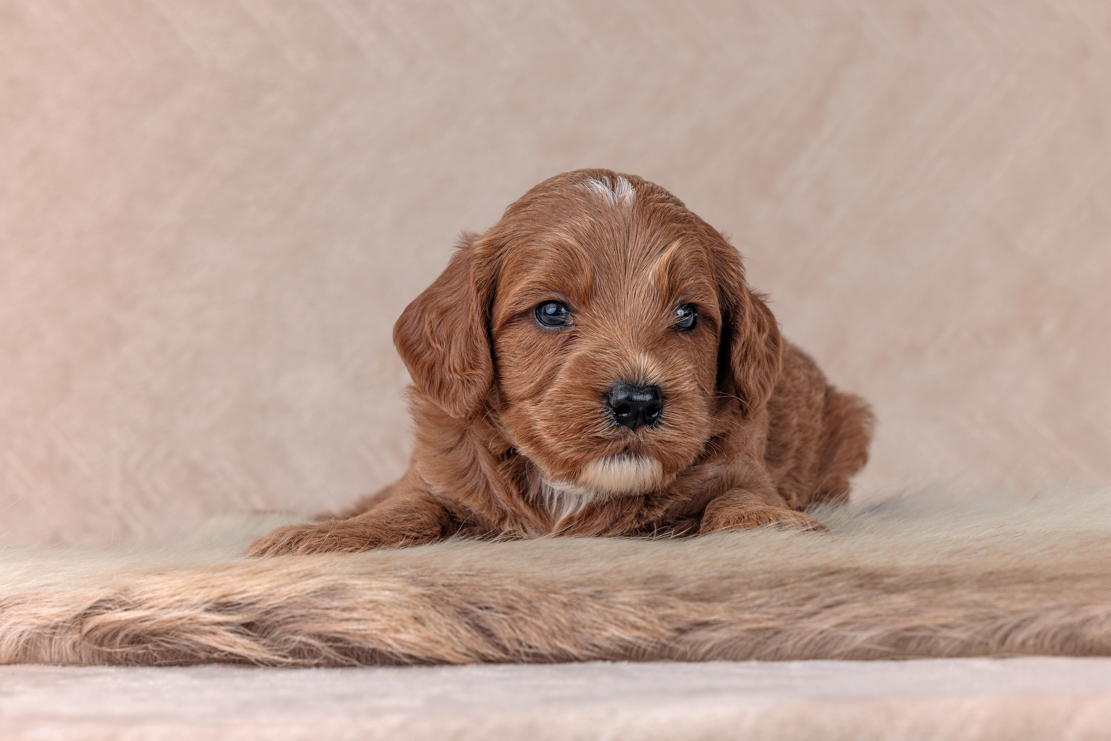 Hij heeft een heerlijk lief en speels karakter en hij heeft een bijzonder zachte fluffy fleece vacht. We verwachten dat hij een grote mini (of kleine medium) gaat worden, ofwel zijn stokmaat (de afstand van de grond tot aan de bovenrand van de wervelkolom (ter hoogte van de schouder) zal net onder of net boven de 43 cm uit gaan komen.