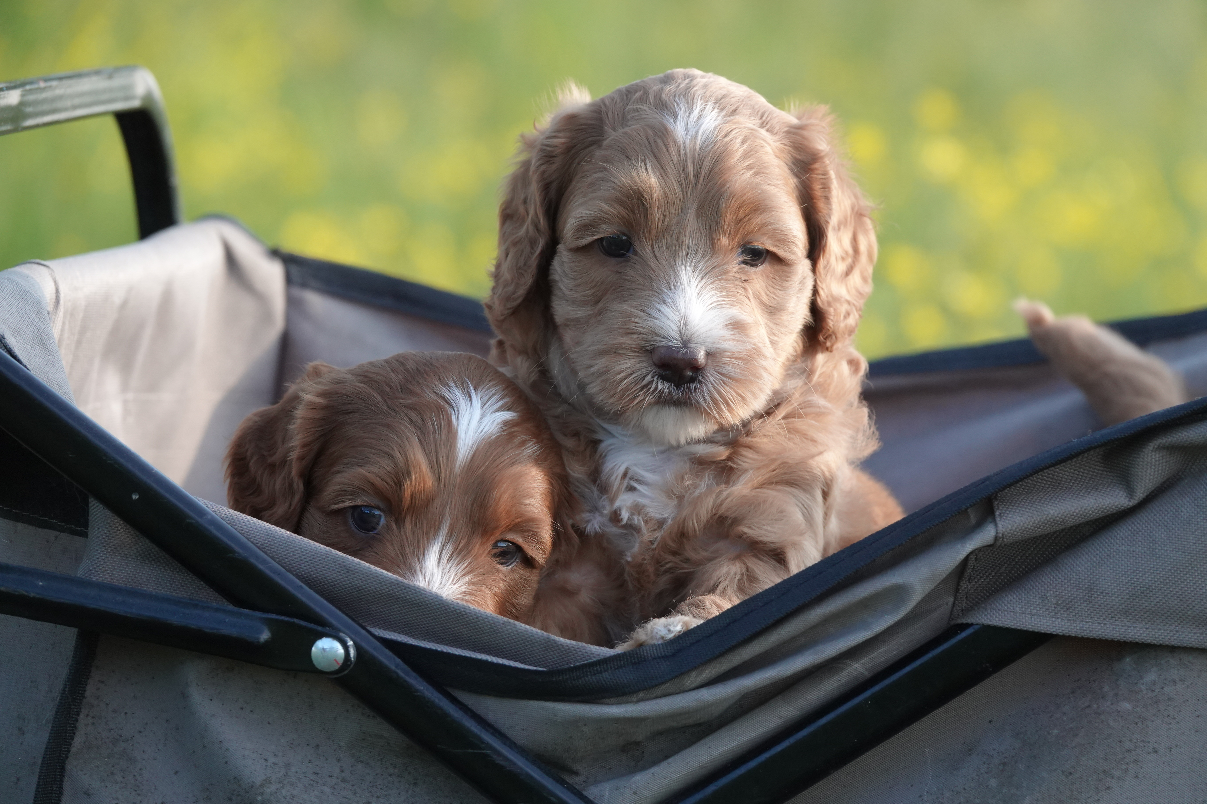 We hebben vanavond met de pups een uitstapje gemaakt met de bolderkar, naar een bloemrijk veld aan de overkant van de straat.