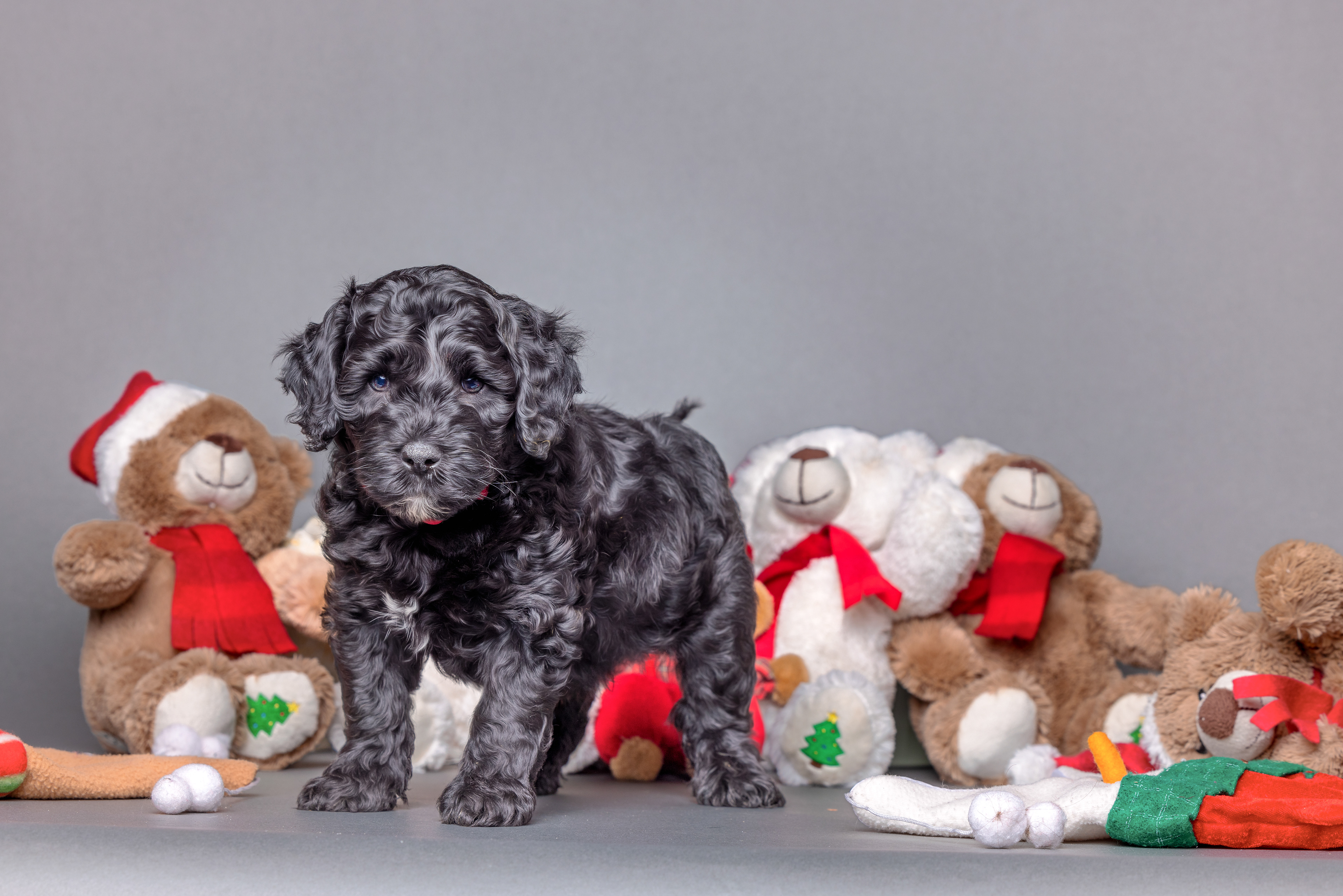 Het is al weer even geleden dat ik foto's van de pups van Roosje heb gemaakt. Dat heeft natuurlijk alles te maken met het feit dat we samen werken met Dennis en Eva en hun pups nu bijna de leeftijd hebben om naar hun nieuwe baasjes te gaan. En dan heb je toch iets meer tijd voor de pups zelf nodig en is het maken van foto's even van ondergeschikt belang. Het was vandaag mooi weer, dus de oudere pups mochten heerlijk buiten spelen en dus kon ik met deze kleintjes de studio in. Ik bedacht dat het ook best fijn zou zijn als het eens een keer zou gaan sneeuwen de komende dagen. Het ziet er in werkelijkheid nog niet naar uit dat dat gaat gebeuren, maar ik kan natuurlijk wel een beetje dromen en mijn dromen komen op een foto meestal uit!